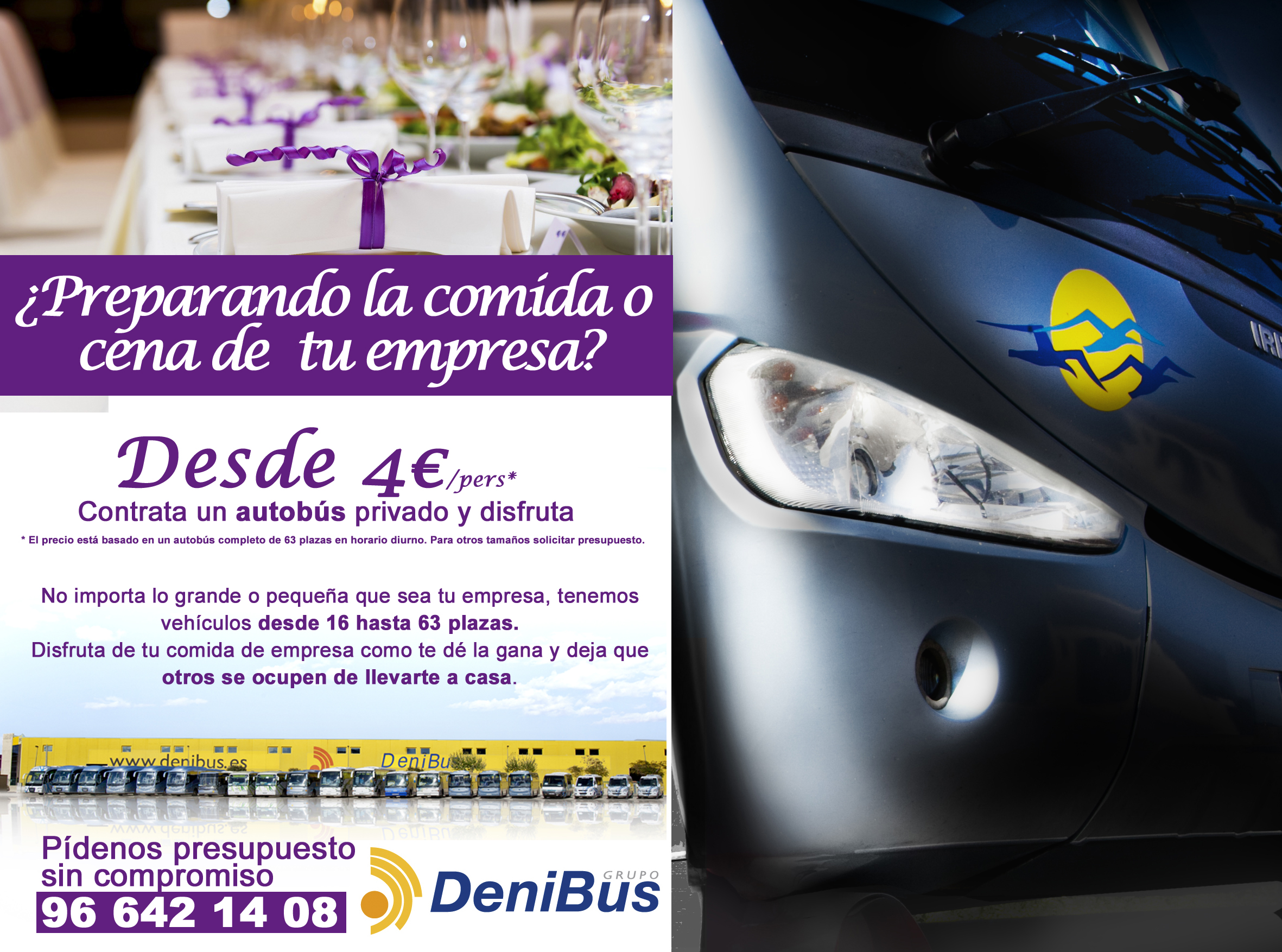 Disfruta de la comida de empresa, y deja que Denibus te lleve a casa por un precio razonable. Desde 4€ por persona, contrata un autobús privado y olvídate de las preocupaciones, lo importante es disfrutar del momento!