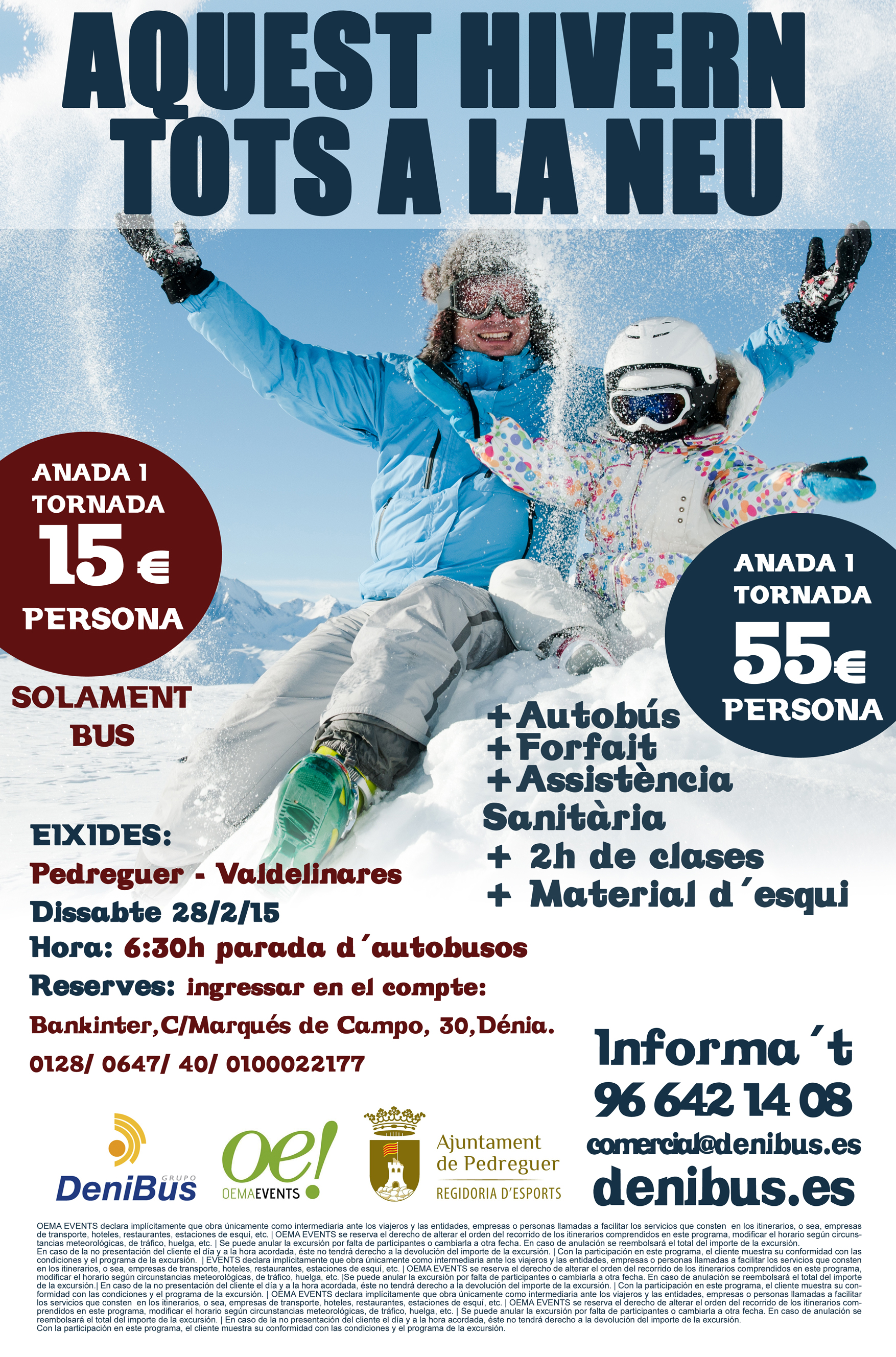 El ayuntamiento de Pedreguer organiza un viaje a la estación de esquí de Valdelinares desde 15€ ida y vuelta, en el caso que sí vayas a esquiar por 55€. Te llevaremos a pie de pista para que disfrutes de un día de nieve con los tuyos.
